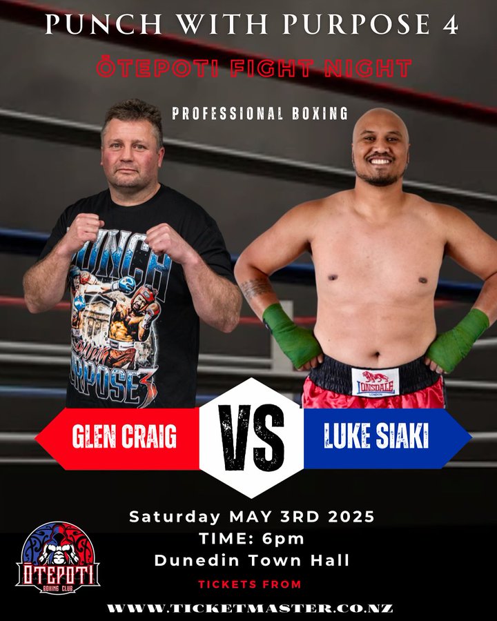 Glen Craig returns to the ring following his pro debut win last November, headlining the main event against Luke Siaki on Saturday, May 3rd, at Dunedin Town Hall. Expect an exciting showdown as both fighters look to make their mark.