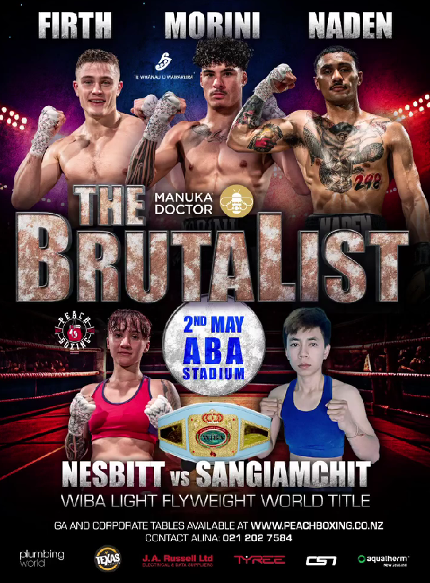 "THE BRUTALIST" – Unbeaten prospects Sonny Morini, Keanu Naden, and Oliver Firth are set to return to the ring against opponents yet to be confirmed, while Emma Nesbitt battles Natthanan Sangiamchit for the vacant WIBA World Light Flyweight Title. The action unfolds on Friday, May 2, 2025, at ABA Stadium, Auckland, New Zealand.