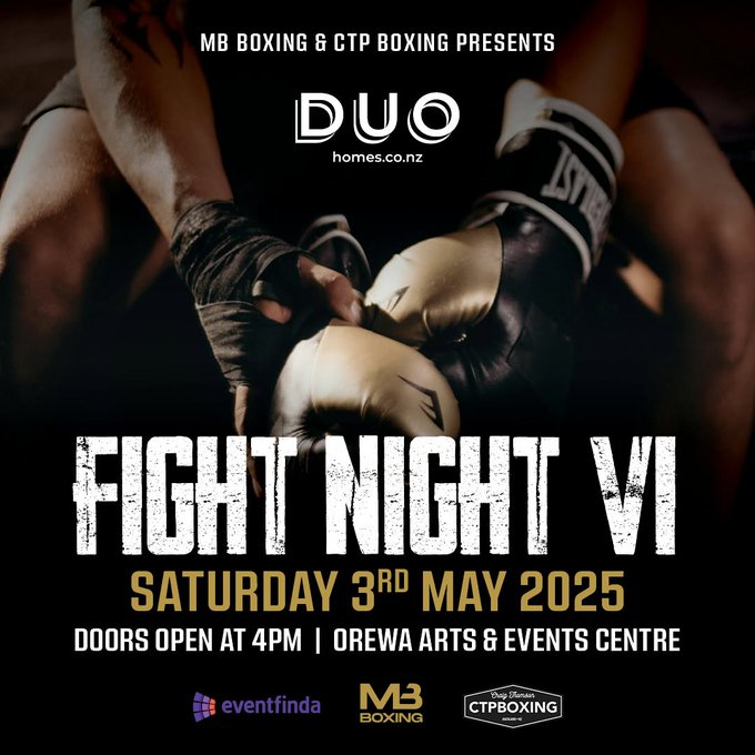 "FIGHT NIGHT VI" – CTP Boxing & MB Boxing return with the sixth installment of their action-packed series! The pro boxing main event features Nikolas Charalampous, while Prince Chingy makes his highly anticipated pro debut. Saturday, May 3, 2025, at the Orewa Arts and Events Centre, Orewa, New Zealand.